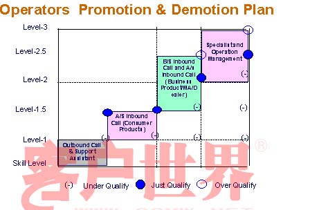 下面一個(gè)我還是對(duì)呼叫中心本身來說,上一頁(yè)的內(nèi)容是在整個(gè)公司的集團(tuán)里面怎么去定義呼叫中心人員的技術(shù)定位。那對(duì)于呼叫中心本身來說,實(shí)際上也不是所有的工程師和座席服務(wù)代表他的技能都是一樣的,可以看到不同的座席服務(wù)代表他的定義是不一樣的,從Level1到Level3,對(duì)每一個(gè)階段的員工來說,都有一個(gè)被提升的空間。同時(shí)作為高一級(jí)的座席服務(wù)代表,如果他的表現(xiàn)不好的話,也都有被降格的路徑,所以說這樣的話,就兩條路比較公平,比較公正。