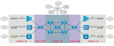 城域網(wǎng)包括核心層、匯聚層以及接入層,主要用于承載本域PU、CU與本域中心服務平臺之間的媒體及信令傳送。城域網(wǎng)的網(wǎng)絡承載模型如下圖所示: