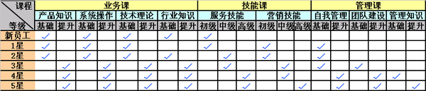 如上表,我們對于不同服務(wù)等級的員工,會安排不同難度的課程,并且隨著座席代表服務(wù)等級的提升,從單純的業(yè)務(wù)課會更多地變?yōu)槎囝愋偷呐嘤?xùn)課程,從更多的方面來整體提升座席代表的服務(wù)品質(zhì)。