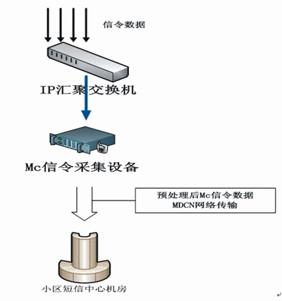 設計人員在軟交換機房內對TAP匯聚后的Mc信令鏈路或者是交換機鏡像的Mc信令鏈路接入到Ip信令匯聚交換機后,要用專門的信令采集設備進行信令數據采集。為節(jié)省MDCN網絡傳輸帶寬,建議將預處理后的信令數據傳輸到小區(qū)短信業(yè)務平臺中心機房(如圖3所示)。