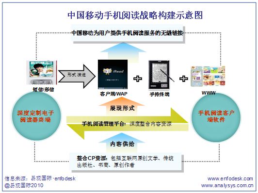 易觀國際(Analysys International)分析認(rèn)為,中國移動發(fā)展手機閱讀的整體思路是基于渠道資源,縱貫內(nèi)容、終端以強勢整合手機閱讀的產(chǎn)業(yè)鏈。將原有的手機閱讀的短信/彩信形式演變?yōu)榭蛻舳塑浖?WAP、手持終端、WWW的形式,最終為用戶提供手機閱讀的無縫鏈接體驗。