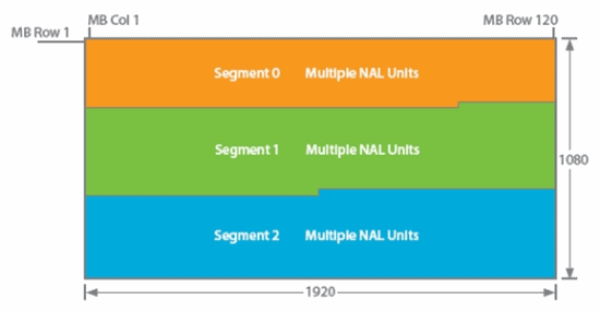 在這種架構中,編碼器的實施分配到多個 DSP 內(nèi)核。每個宏塊條都分配到一個DSP內(nèi)核。其中每個內(nèi)核都提供一些特定功能,如:速率控制與幀內(nèi)圖像處理。事實上,無法預先進行比特預算并分配到各個宏塊條,因為不同宏塊條可能具有不同的圖像復雜性,而在圖像分割塊之間采用差異很大的Qp值會造成合成圖像的層邊界出現(xiàn)偽影。在H.264中,宏塊條NAL可以包含任意數(shù)量的宏塊,因此與H.263不同,圖像分割塊的形狀無需符合GOB邊界。每個宏塊條的頭部(slice