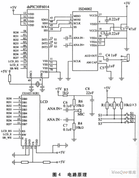 電路原理如圖4所示。整個(gè)電路由語(yǔ)音錄放電路、話筒輸入電路、按鍵開(kāi)關(guān)電路及LCD顯示電路構(gòu)成。由于本設(shè)計(jì)輸出直接驅(qū)動(dòng)普通耳機(jī),經(jīng)實(shí)驗(yàn)不需外部功放電路,直接利用ISD4002內(nèi)部功放輸出即可。ISD4002作為從機(jī),其SPI接口的MOSI接控制器的SDO;MISO接控制器的SDI;SCLK接SCK;SS接控制器的SS即可。LCD用于人機(jī)交互的界面顯示。