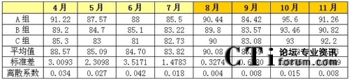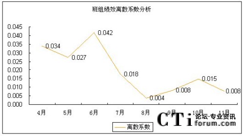 無論從標(biāo)準(zhǔn)差的走勢還是從離散系數(shù)的走勢上來看,8-11月各班組的績效得分差距明顯比4-7月的績效得分差距要小。從另一個(gè)角度來看,就是該呼叫中心各班組的績效水平更趨于均衡,呼叫中心人員的整體技能和服務(wù)水平的二極化差異開始縮小。