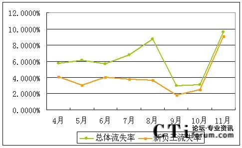 從該中心的運(yùn)營數(shù)據(jù)來看,另一個(gè)發(fā)生明顯變化的就是實(shí)行團(tuán)隊(duì)激勵(lì)后新員工的流失率開始明顯增加。以下是我們提取4-11月該呼叫中心員工流失方面的數(shù)據(jù):