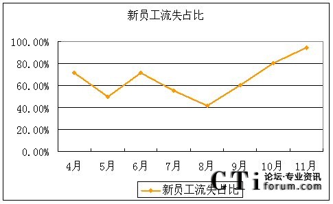而對流失員工的結(jié)構(gòu)性分析我們發(fā)現(xiàn),4-11月期間新員工流失占總體流失人數(shù)的比例在不斷上升,4-8月基本在50%上下波動(dòng),而從9月份開始直線上升,到11月份更達(dá)到了占到流失總?cè)藬?shù)的94.12%。當(dāng)月有16名入職不到三個(gè)月的新員工離職,而老員工只有1人離職。