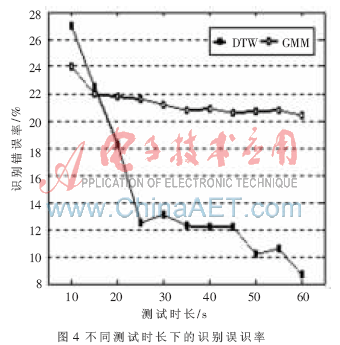 圖4給出基于DTW識(shí)別方法與GMM模型(混元數(shù)64)識(shí)別G.729編碼方案863語料庫的文本相關(guān)說話人的誤識(shí)率對(duì)比圖。橫坐標(biāo)代表的測(cè)試語音的時(shí)長(zhǎng),縱坐標(biāo)代表識(shí)別誤識(shí)率。由實(shí)驗(yàn)結(jié)果可知在文本相關(guān)的說話人識(shí)別中,基于DTW算法的識(shí)別率在絕大多數(shù)情況下高于GMM模型,且隨著測(cè)試語音的增長(zhǎng),優(yōu)勢(shì)更明顯。