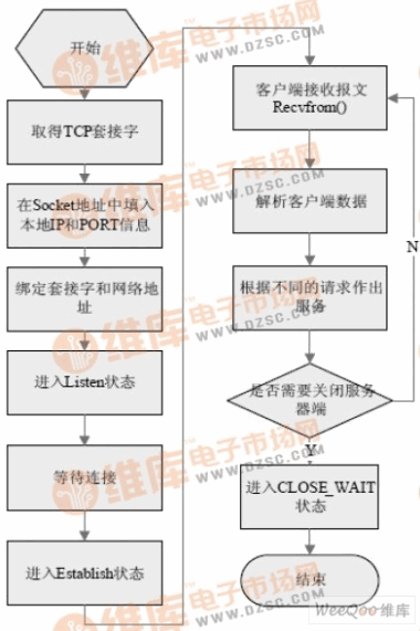 處理抽象。本應(yīng)用中需要派生一個(gè)QTcp 類(lèi),實(shí)現(xiàn)傳輸層的TCP 協(xié)議。一般基于 TCP 的網(wǎng)絡(luò)應(yīng)用程序都要繼承QTcp 類(lèi),然后在ESTABLISHED 狀態(tài)中添加 子狀態(tài)完成特定的功能。在服務(wù)器端,利用量子框架實(shí)現(xiàn)一個(gè)QServer 類(lèi),是一個(gè)活動(dòng)對(duì)象,繼承自QTcp 類(lèi)。QServer 活動(dòng)對(duì)象同客戶(hù)端TCP Socket 連接后,進(jìn)入ESTABLISHED狀態(tài)中,通過(guò)調(diào)用Recvfrom 函數(shù)接收客戶(hù)端的請(qǐng)求,然后解析請(qǐng)求的服務(wù)類(lèi)型,根據(jù)不同請(qǐng)求做出不同的服務(wù)。其軟件流程圖如圖1 所示:
