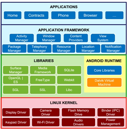 首先我們先來看到Android的基本技術(shù)架構(gòu),Android是以Linux為核心,并采用軟件堆迭(software stack)的架構(gòu)延伸發(fā)展的一套軟件平臺(tái)與操作系統(tǒng)。根據(jù)下圖可以看出,其基本架構(gòu)分為五層: