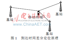 TDOA定位技術(shù)是根據(jù)不同基站接收到的同一移動終端信號在傳輸路徑上的時延差異實現(xiàn)終端定位。當移動終端發(fā)出緊急呼叫時,移動網(wǎng)絡(luò)通過其附近的三個或更多個不同基站接收并測量出信號的到達時間,網(wǎng)絡(luò)計算出到達時間兩兩之間的差值,移動終端必然位于這些時間差值所對應(yīng)的以兩兩基站為焦點的雙曲線上[2]。這樣,根據(jù)兩條雙曲線的交點就能夠確定手機的位置。所以只要附近三個基站接收到移動終端發(fā)出的信號就可以達到定位目的。TDOA技術(shù)只需要移動通信網(wǎng)絡(luò)參與網(wǎng)絡(luò)參數(shù)的測量,不需要對終端硬件上的改動。因此實現(xiàn)TDOA定位只需要在移動通信網(wǎng)中增加相應(yīng)功能模塊就可以了,并支持所有廠商生產(chǎn)的移動終端。同時它具有定位精度高、響應(yīng)時間短、實現(xiàn)簡單等優(yōu)點。