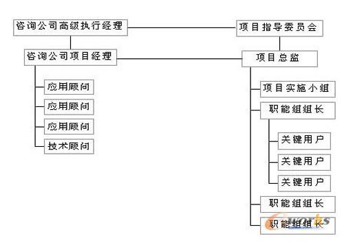階段2:項(xiàng)目啟動(dòng) 這支隊(duì)伍既有企業(yè)高級(jí)管理層所組成的指導(dǎo)委員會(huì)和咨詢(xún)公司人員,也有來(lái)自信息部門(mén)的技術(shù)人員和相應(yīng)職能部門(mén)的熟悉企業(yè)流程的業(yè)務(wù)人員所組成的實(shí)施小組和職能小組。項(xiàng)目隊(duì)伍組織結(jié)構(gòu)如圖所示