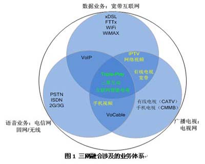 這種沖擊表現(xiàn)在信息通信領(lǐng)域的“時(shí)移事易”上,一個(gè)是在時(shí)間維度上,一個(gè)是在影響產(chǎn)業(yè)發(fā)展重大事件的維度上。其長期累積的結(jié)果是,當(dāng)前全球范圍內(nèi)影響最大、最深遠(yuǎn)的莫過于寬帶網(wǎng)絡(luò)成為國家的信息化基礎(chǔ)設(shè)施。寬帶的普及深刻的影響和推動(dòng)了以TCP/IP為技術(shù)基礎(chǔ)的“三重播放”和在市場競爭層面的“多重捆綁”業(yè)務(wù)營銷策略,這構(gòu)成了三網(wǎng)融合最基本的內(nèi)容,隨之帶動(dòng)了近年已成為業(yè)界關(guān)注焦點(diǎn)的視頻業(yè)務(wù)向“一云三網(wǎng)多屏”的方向發(fā)展?傊录夹g(shù)和新產(chǎn)業(yè)發(fā)展導(dǎo)致傳統(tǒng)的電信業(yè)和廣播電視業(yè)從封閉逐步走向開放,渠道、內(nèi)容、消費(fèi)者偏好均從單一走向多元;對(duì)消費(fèi)者而言,信息的流動(dòng)從單向變?yōu)殡p向和多向,新媒體、全媒體、自媒體在社會(huì)上的份量快速上升。 而來自市場的需求變化是:過去那種內(nèi)容和服務(wù)緊密捆綁于網(wǎng)絡(luò)的業(yè)務(wù)模式被開放的互聯(lián)網(wǎng)沖擊得疲于招架,網(wǎng)絡(luò)和渠道的地位不斷下降,處于底層的網(wǎng)絡(luò)整合開始朝著契合于上層內(nèi)容和應(yīng)用整合的方向發(fā)展;內(nèi)容和應(yīng)用成為產(chǎn)業(yè)發(fā)展的新重心,傳統(tǒng)運(yùn)營商在挖潛增效做好“智能管道”的同時(shí),也希望借助三網(wǎng)融合躋身綜合信息服務(wù)領(lǐng)域。表現(xiàn)在網(wǎng)絡(luò)層面,傳統(tǒng)的電信業(yè)務(wù)大范圍地向?qū)拵P網(wǎng)上遷移;傳統(tǒng)的有線電視網(wǎng)進(jìn)軍新媒體,“電信化”色彩越來越強(qiáng)。在業(yè)務(wù)層面,如下圖示所,典型的融合業(yè)務(wù)如有線寬帶、IPTV、VoIP、手機(jī)視頻、互聯(lián)網(wǎng)智能電視等成為雙方競爭的主陣地。