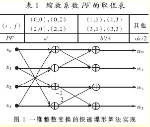 ·2q,PF稱為縮放系數(shù),根據(jù)元素在陣列塊中的不同位置,其取值如表1所示,Qstep為量化步長,由0至51共52個量化參數(shù)QP決定,QP增加1,Qstep增加12.5%;q=15+QP/6,QP/6取整數(shù);對于幀內(nèi)宏塊f取2q/3,幀間宏塊f取2q/6。需要指出的是,MF的值可根據(jù)PF和QP的取值經(jīng)簡單計(jì)算得到,并可形成表格,通過查表方式便可實(shí)現(xiàn)硬件運(yùn)算,并有效地提高了運(yùn)算速度。