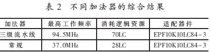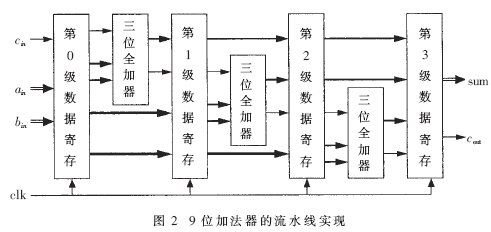 (2)針對不同運(yùn)算的位寬需要,設(shè)計(jì)專用的加法器和乘法器。本文對整數(shù)變換中的加法器采用三級流水線加法器,實(shí)現(xiàn)9位加法,每級流水線完成三位超前進(jìn)位加法,將邏輯延遲限制在三位加法器之內(nèi)。圖2給出了9位加法器的流水線實(shí)現(xiàn)框圖。選用EPF10K10LC84-3作為適配器件,經(jīng)過Synplify Pro 7.3綜合,結(jié)果表明這種加法器具有較優(yōu)的最高工作頻率和硬件開銷。如表2所示, 常規(guī)加法器的最高工作頻率為37.0MHz,消耗資源卻為28LC,而經(jīng)過優(yōu)化的三級流水線加法器在消耗資源增加不多的情況下,其最高工作頻率相比常規(guī)加法器提高了257%,達(dá)到94.5MHz。