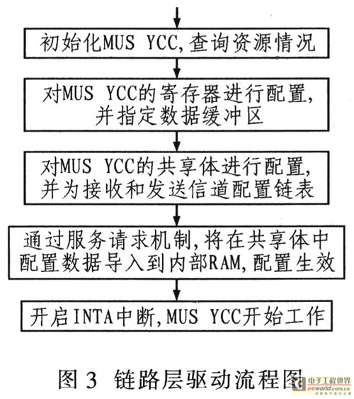鏈路層HDLC控制器主要完成內(nèi)部寄存器和映射的共享體配置。共享體用于HDLC寄存器的初配、接收和發(fā)送緩沖區(qū)以及時(shí)隙映射表的配置。HDLC控制器為每個(gè)信道都建立一個(gè)消息鏈表,這樣數(shù)據(jù)緩沖區(qū)可以循環(huán)利用。HDLC控制器與成幀器的對(duì)應(yīng)關(guān)系決定于HDLC控制器端口映射方式的設(shè)置。其配置流程如圖3所示。