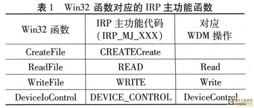 在Windows中,應(yīng)用程序與WDM通信的實(shí)現(xiàn)過程:應(yīng)用程序應(yīng)先獲得設(shè)備句柄GUID碼,然后利用CreateFile函數(shù)打開設(shè)備,通過 DeviceIoControl函數(shù)傳遞控制代碼參數(shù)和WDM進(jìn)行通信,包括從WDM中讀取數(shù)據(jù)和寫數(shù)據(jù)給WDM兩種情況,也可利用ReadFile從 WDM中讀取數(shù)據(jù)或用WriteFile寫數(shù)據(jù)給WDM:當(dāng)下層驅(qū)動(dòng)有觸發(fā)事件時(shí),就需要Event事件通知上層軟件。當(dāng)應(yīng)用程序退出時(shí),CloseHandle則關(guān)閉設(shè)備,這將產(chǎn)生對(duì)應(yīng)于此設(shè)備對(duì)象的相應(yīng)IRP消息。這種關(guān)系如表1所列。