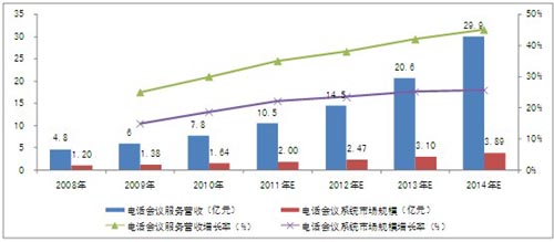 圖表 4 2008-2014年中國電話會議市場規(guī)模及增長率