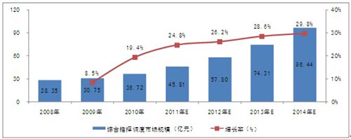 受市場的推動,未來幾年我國綜合指揮調(diào)度系統(tǒng)建設(shè)的范圍將逐步擴(kuò)大。2011到2014年,我國綜合指揮調(diào)度市場的復(fù)合增長率將達(dá)到28.16%,2014年市場規(guī)模將達(dá)到96.44億元。