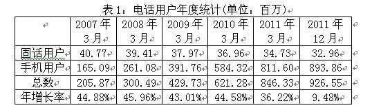 政府對電信市場的開放不僅帶來了電信產業(yè)的快速發(fā)展,激烈的競爭也令消費者享受到性價比更高的服務。近幾年,電話用戶總數(shù)持續(xù)增長,從1999年的2281萬增加到2011年3月底的8億4633萬。截至2011年12月31日,電話用戶總數(shù)達到9億2655萬,說明從2011年4-12月期間新增用戶8022萬。其中,手機用戶數(shù)增長最為顯著,從2007年的1億6509萬增加到2011年3月的8億1160萬,2011年12月底達到8億9386萬。但是,固話用戶的數(shù)量則從2007年的4077萬減少到2011年3月的3473萬,到2011年12月僅有3269萬。(見表1)