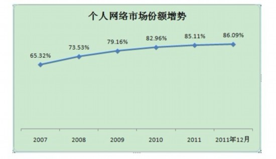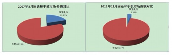 手機的增長非常顯著,從2007年開始,手機用戶每年以42.7%的速度增長。手機的市場份額從2007年的80.19%增加到2011年12月的96.47%,現(xiàn)在已經遠遠超過了固話。