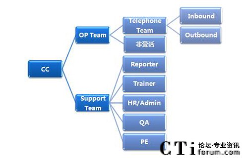 呼叫中心的組織結(jié)構(gòu)和人員構(gòu)成,按照橫向切面來看,分別存在有:一線、二線(值班長(zhǎng))、TL、SV、OM等職位,按照縱向切面來看,分別存在有:運(yùn)營(yíng)團(tuán)隊(duì)和支撐團(tuán)隊(duì),運(yùn)營(yíng)團(tuán)隊(duì)包括有:受話團(tuán)隊(duì)(Inbound和Outbound)、非受話團(tuán)隊(duì),支撐團(tuán)隊(duì)包括有:報(bào)表專員、培訓(xùn)專員、人事行政專員、質(zhì)控專員、流程工程師等崗位。圖形展示為:
