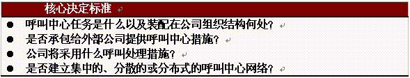 。。呼叫中心的主要任務(wù)將影響許多重要決定,這些決定關(guān)于呼叫中心功能、呼叫處理措施、內(nèi)部或外部聯(lián)絡(luò)措施,以及呼叫中心結(jié)構(gòu),即集中型或分散型。