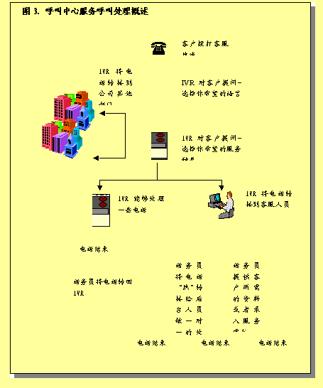 圖3概述了呼叫中心服務呼叫處理過程。描述了進入呼叫中心系統(tǒng)的各種呼叫如何完成處理過程,或者由真人代表完成,或者是通過IVR技術(shù)完成。
