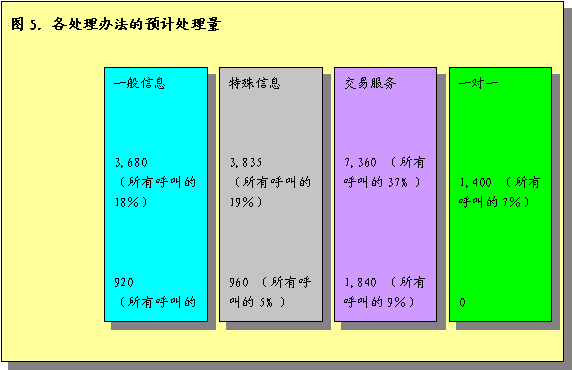 根據(jù)預計呼叫量的分析,估計人工代表將處理16300個呼叫,IVR將處理余下的3700個呼叫。圖5圖示了各呼叫處理辦法預計處理的呼叫量。