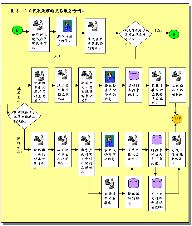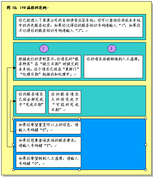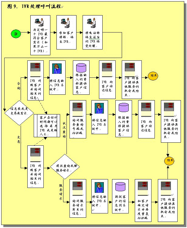 根據(jù)呼叫處理部分所作的說明,在完成初次聯(lián)絡過程之后,服務代表將確定呼叫者的需要。之后服務代表將協(xié)助呼叫者或者使其選擇IVR系統(tǒng),該系統(tǒng)通過自動為這些請求錄音提供相關的信息和服務。服務代表將接受培訓識別哪些交易服務和信息服務可以通過IVR進行,這樣他們可以使呼叫者選擇自我服務。圖9圖示了用這一辦法處理呼叫的過程。