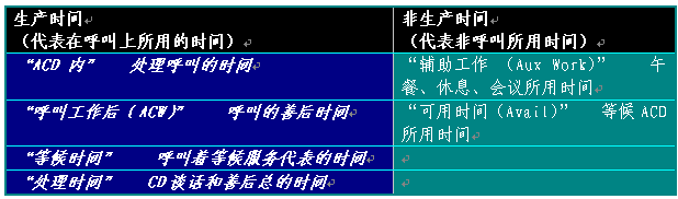 如果工作狀態(tài)最佳,代表的工作目標(biāo)為80%的時間用在呼叫上,其余為非生產(chǎn)時間。主管運用ACD報告結(jié)合第一手調(diào)查資料考察這些工作所用的時間。
