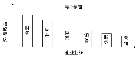 很顯然,企業(yè)間業(yè)務(wù)的相似程度越高,采用商用軟件的有效率越高,企業(yè)在采用商用軟件的時(shí)候軟件的客戶化定制就越少,實(shí)施的成功率越高。財(cái)務(wù)軟件是目前商用軟件通用最有效的企業(yè)管理軟件就是明證。從圖中可以看出前面的幾種業(yè)務(wù),是 傳統(tǒng)ERP軟件支持的功能;而后面的銷售、服務(wù)和市場是目前CRM軟件所要實(shí)現(xiàn)的功能。如果說,企業(yè)采用現(xiàn)有的ERP商品套件來滿足企業(yè)運(yùn)營管理的需要還需要30%的客戶化工作,那么如果采用商用的CRM軟件,軟件廠商提供的軟件要應(yīng)用于企業(yè),就需要更多的客戶化工作,這個(gè)比例幾乎接近于企業(yè)自己開發(fā)。