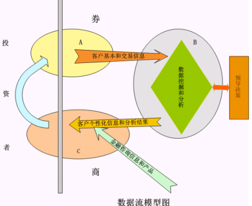 。。在整個(gè)的數(shù)據(jù)流循環(huán)模型中,可以分為三個(gè)模塊:A模塊,客戶(hù)通過(guò)交易通道進(jìn)行投資活動(dòng);B模塊,根據(jù)客戶(hù)的基本信息和交易信息,進(jìn)行大量的數(shù)據(jù)挖掘和數(shù)據(jù)分析,為領(lǐng)導(dǎo)決策進(jìn)行支持,并且得到客戶(hù)的個(gè)性化信息和各種分析結(jié)果;C模塊,根據(jù)各種數(shù)據(jù)的分析結(jié)果,同時(shí)根據(jù)投資咨詢(xún)師手中現(xiàn)有的信息產(chǎn)品,為客戶(hù)提供真正的個(gè)性化的咨詢(xún)服務(wù),并且把此個(gè)性化的咨詢(xún)服務(wù)即時(shí)傳遞給投資者,為客戶(hù)進(jìn)行下一次的投資活動(dòng)而準(zhǔn)備。