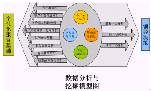 。。從上圖可以看出,在這個(gè)客戶信息數(shù)據(jù)分析模塊當(dāng)中,主要分析對(duì)象是客戶的基本信息、客戶的實(shí)時(shí)交易信息、客戶的歷史交易信息、客戶帳戶信息和市場(chǎng)行情信息等幾個(gè)處于孤島形狀的信息模塊。而得到的分析結(jié)果應(yīng)該包括如下幾個(gè)基本方面,以被為領(lǐng)導(dǎo)的決策和企業(yè)的業(yè)務(wù)流程服務(wù):