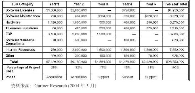 其它:這個類別涉及到上述種類中不含的TCO 成本,以便涵蓋項目評估流程期間的錯誤與疏忽部分,并作為項目執(zhí)行期間的假設(shè)與業(yè)務(wù)狀況的變化。許多公司都納入的成本實(shí)例有項目意外事故、房地產(chǎn)、附加的與正在進(jìn)行的培訓(xùn)、以及T&E 等。