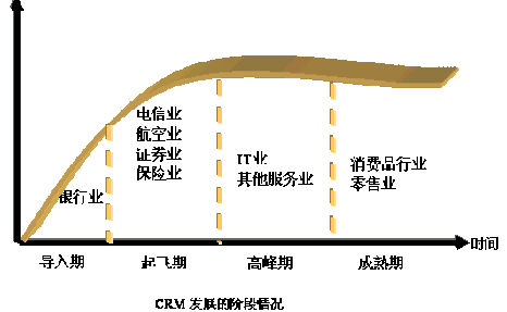 從圖中我們可以大致看出CRM的發(fā)展情況。保險(xiǎn),電信行業(yè)對(duì)這比較重視,而且得到了一定的應(yīng)用。但是在其他行業(yè)中的發(fā)展仍然比較緩慢。面對(duì)中國的龐大市場,從CRM的發(fā)展中不難看出:會(huì)隨著經(jīng)濟(jì)的發(fā)展得到長足的發(fā)展。隨著經(jīng)歷早期客戶是蒙昧期,后來是觀察期,現(xiàn)在是選擇期,CRM市場可能出現(xiàn)爆炸性的增長。CRM本身是很好的,發(fā)展到一定階段,引導(dǎo)期已經(jīng)過了,又會(huì)發(fā)展起來。