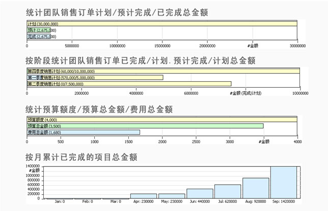 在VamCRM項目組合管理中集成項目數(shù)據(jù)的統(tǒng)計與分析,可以直接監(jiān)控項目計劃、預計及完成的項目數(shù)量、總金額和費用的統(tǒng)計,也可按月累計已完成的項目數(shù)量、總金額和費用,直接衡量項目實施的結果與效益。在費用管理模塊中集成費用數(shù)據(jù)的統(tǒng)計與分析,對于所有費用可以按人及費用類型進行統(tǒng)計,實時知道哪一個人或哪一類費用開銷最多,以及費用與預算的對比分析。