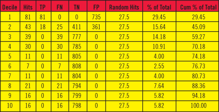 Decile-分組序號(hào);Hits-命中數(shù),即每組內(nèi)包含的實(shí)際響應(yīng)數(shù),等于TP+FN;