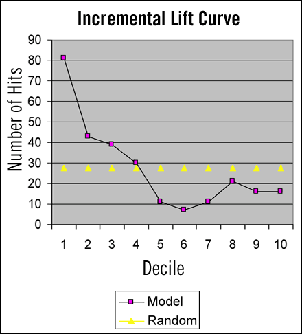 在增量提升曲線中標(biāo)示了各個(gè)分段的命中數(shù)。 在圖1中可以看到,增量提升曲線在第4個(gè)分段后和隨機(jī)期望線(275個(gè)響應(yīng)的10%,即平均每個(gè)分段27.5個(gè)響應(yīng))交叉。
