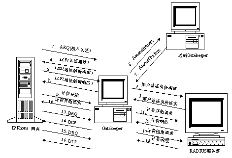 2、用戶(hù)認(rèn)證:網(wǎng)關(guān)用ARQ把用戶(hù)卡號(hào)和密碼發(fā)給網(wǎng)守,網(wǎng)守再把卡號(hào)和密碼送給計(jì)費(fèi)認(rèn)證中心,如果計(jì)費(fèi)認(rèn)證中心認(rèn)證通過(guò),網(wǎng)守向網(wǎng)關(guān)發(fā)ACF,否則回ARJ。