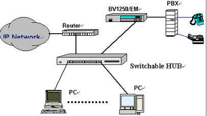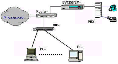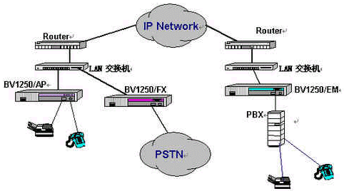 OKI公司的IVG BV1250互聯(lián)網(wǎng)絡IP電話語音網(wǎng)關就是一種非常好的選擇,完全基于H.323 Ver2.0協(xié)議,實現(xiàn)語音和傳真在因特網(wǎng)上傳輸。使用BV1250 進行IP電話和IP FAX通信時,可以感覺到與傳統(tǒng)的電話或傳真所提供的服務毫無區(qū)別。運用BV1250,可通過互聯(lián)網(wǎng)(Internet/Intranet)將電話機、傳真機和PBX進行互連,建立專用的IP電話網(wǎng)絡。BV1250使用的是靜態(tài)IP地址,因此不能將BV1250連接到使用DHCP(動態(tài)主機通信規(guī)程)的互聯(lián)網(wǎng)上。常用連接方式如下圖所示: