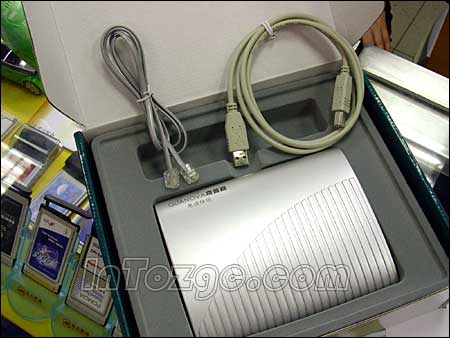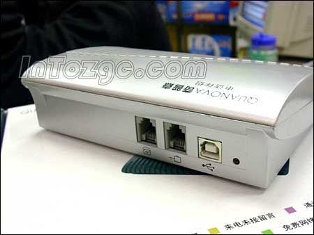 于是俺馬上來(lái)到商家朋友的柜臺(tái),準(zhǔn)備看看究竟是何方“神圣”,能有如此的本事?老板笑呵呵的將產(chǎn)品包裝打開(kāi),從里面拿出了一個(gè)銀色的盒子,全塑外殼,材質(zhì)還算不錯(cuò)。個(gè)頭倒也不小,表面積和一個(gè)普通的鼠標(biāo)墊差不多,流線型機(jī)身,這款產(chǎn)品外表設(shè)計(jì)非常簡(jiǎn)單,僅在后部設(shè)有兩個(gè)電話(huà)線專(zhuān)用的RJ11口和一個(gè)USB接口,其它就沒(méi)有什么特殊的地方了。