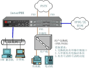 根據(jù)電話交換機(jī)的配置和功能不同,電話交換機(jī)與 interPBX設(shè)備的連接方式有二種常見方式,下面結(jié)合示意圖來具體說明。