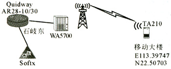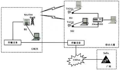 組網時,由于BS(石岐東)需要與廣州的SoftX連接,因此,實際組網方案通過傳輸設備連接公安局與移動大廈;然后通過移動大廈的CMNet網絡連接廣州的SoftX。在該個組網中,視距傳播環(huán)境通過固定在移動大樓支架上的遠端站實現,非視距傳播環(huán)境通過移動的遠端站實現。
