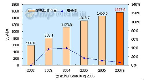 從圖中可以看出,國(guó)內(nèi)IP電話市場(chǎng)近年呈現(xiàn)出快速增長(zhǎng)趨勢(shì),2002-2007年年均增長(zhǎng)率為20.7%。預(yù)計(jì)2007年IP電話的通話時(shí)長(zhǎng)將達(dá)到1567.6億分鐘,同比增長(zhǎng)7%。但從2005年開始,IP電話的增長(zhǎng)率呈下降趨勢(shì),這主要是受管制限制和移動(dòng)長(zhǎng)途的替代作用所致。