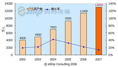 從圖中可以看出,國(guó)內(nèi)即時(shí)通訊用戶數(shù)保持了較快的發(fā)展速度,從 2002-2006年年均增長(zhǎng)率為26.6%,到2007年國(guó)內(nèi)即時(shí)通訊用戶數(shù)將達(dá)到1.3億。