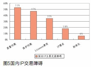 根據(jù)我們對92家芯片設計企業(yè)的問卷調查,IP質量、IP保護和IP費用是目前國內IP核交易中的主要障礙。(見圖5)