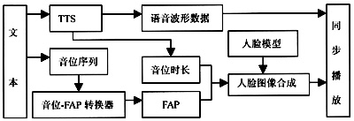 FAP一共有68個(gè)參數(shù),包括兩個(gè)高級(jí)參數(shù)和66個(gè)低級(jí)參數(shù)。高級(jí)參數(shù)是視位(viseme)和表情(expression),視位分為15個(gè),分別表示人們發(fā)某一音位時(shí)的面部動(dòng)作;表情分為高興、悲傷、憤怒、害怕、厭惡、驚奇六種。66個(gè)低級(jí)參數(shù)用來控制部分FDP特征點(diǎn)的運(yùn)動(dòng),進(jìn)而形成各種復(fù)雜的人臉動(dòng)作。這些標(biāo)準(zhǔn)的制定極大地推動(dòng)了參數(shù)控制合成方法的發(fā)展,使這種方法在人機(jī)交互、計(jì)算機(jī)網(wǎng)絡(luò)交談、游戲動(dòng)畫等方面得到更為廣泛的應(yīng)用,圖2 是參數(shù)控制的TTVS系統(tǒng)的基本框架。