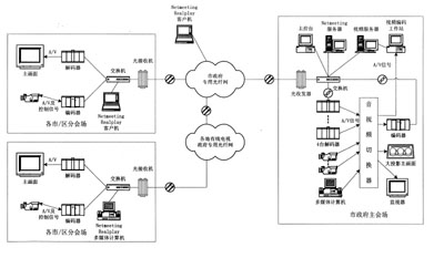 高清晰度視像會議系統(tǒng)的工作原理如圖所示。其中,主會場的音視頻信號經過編碼器壓縮后,由主控臺控制,并通過廣播或組播方式經由政府專用網絡分發(fā)到各分會場;各分會場的音視頻信號經過編碼器壓縮為MPEG2的數(shù)據(jù)流后,通過以太網口發(fā)送至政府專用網絡上,再上傳到主會場的解碼器上并轉換為視頻信號,經視頻陣列器處理后顯示在屏幕上;主控臺可以根據(jù)需要控制各分會場的編解碼器、電動調焦攝像機及控制器。