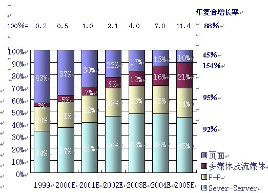 同時(shí),人們對(duì)P-P的互動(dòng)及多媒體的傳輸?shù)男枨髮⒊蔀榫W(wǎng)絡(luò)使用的2個(gè)最主要的發(fā)展趨勢(shì)。據(jù)麥肯錫公司和JP摩根的分析和預(yù)測(cè),多媒體及流媒體的IP流量將以每年154%的復(fù)合率增長(zhǎng),而P—P的IP流量將以95%的年復(fù)合增長(zhǎng)率增長(zhǎng),這2項(xiàng)將成為用戶需求增長(zhǎng)最快的業(yè)務(wù)。如下圖,