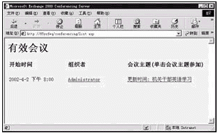 如果在前面已設(shè)置了提醒功能,那么在臨近會議前屏幕上將出現(xiàn)提醒窗口。教師機和學(xué)生機有三種方法可以參加會議:點擊提醒窗口中[參加會議]按鈕;或者不等提醒,直接點擊會議邀請函中的鏈接打開會議網(wǎng)頁;最好的方式還是打開IE,輸入網(wǎng)址http://x/conferencing/list.asp進入會議(x為Exchange服務(wù)器的IP地址或計算機名),如圖3。